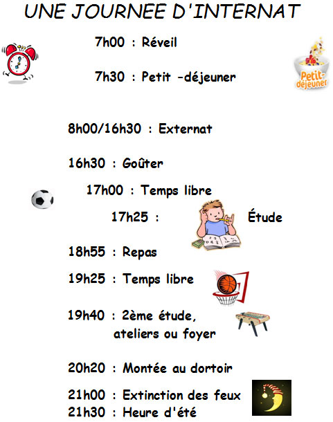 Le dortoir doit demeurer un lieu calme, propre et de repos pour les élèves, toute activité bruyante est à éviter. Une caisse de livres est mise à disposition des élèves dans chaque dortoir. Le respect des horaires d’internat s’impose à tous.